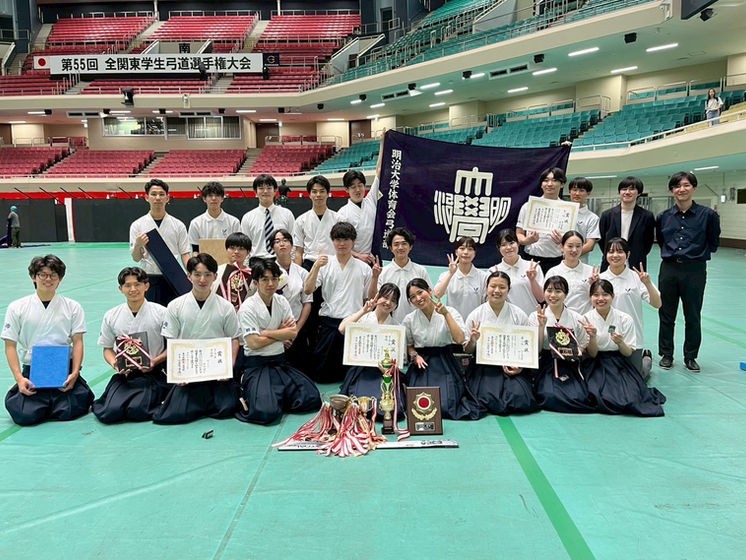 明治大学体育会弓道部は、明治41年(1908年)3月学友会弓術部として正式に活動を始めました。 創部当初から弓馬術礼法の小笠原流宗家が師範として御指導くださり、明治大学の「弓」の基礎が確立され、 今日まで4代の宗家にお世話になっております。 戦前までは早稲田大学、慶応義塾大学と共に学生弓道界のリーダーとして、 多くの大会やリーグ戦で数々の優勝を記録してきました。 戦中、戦後の混乱期を乗り越え、昭和30年代も「常勝の明治大学」と言われていました。 昭和39年に「女子部」が併設され、男女共に好成績を挙げていきました。 部員も常に数十名登録し活況を呈していました。 昭和42年に道場が和泉校舎から生田校舎に移転になり、世相を反映し部員数の減少となりましたが、 充実した環境のもとで、活発な活動が行われております。 そんな中でも全関東大会、全日本大会、リーグ戦で度々団体優勝や個人優勝がありました。 礼儀を重んじ、基本を大事に中りに拘る明治大学の「射」は100年以上の伝統があります。